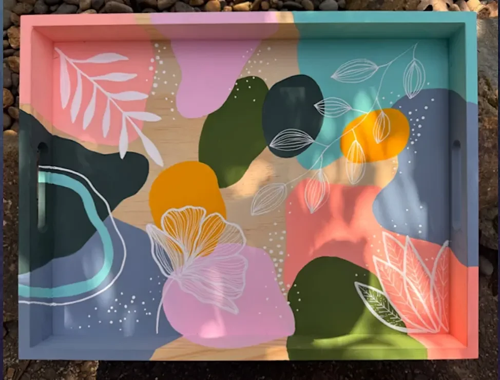 All Materials are provided. Each Artist gets their choice of paint colors and acrylic paint markers to create with on a wood serving tray with handles ( approx. 11 x 14 in size ).