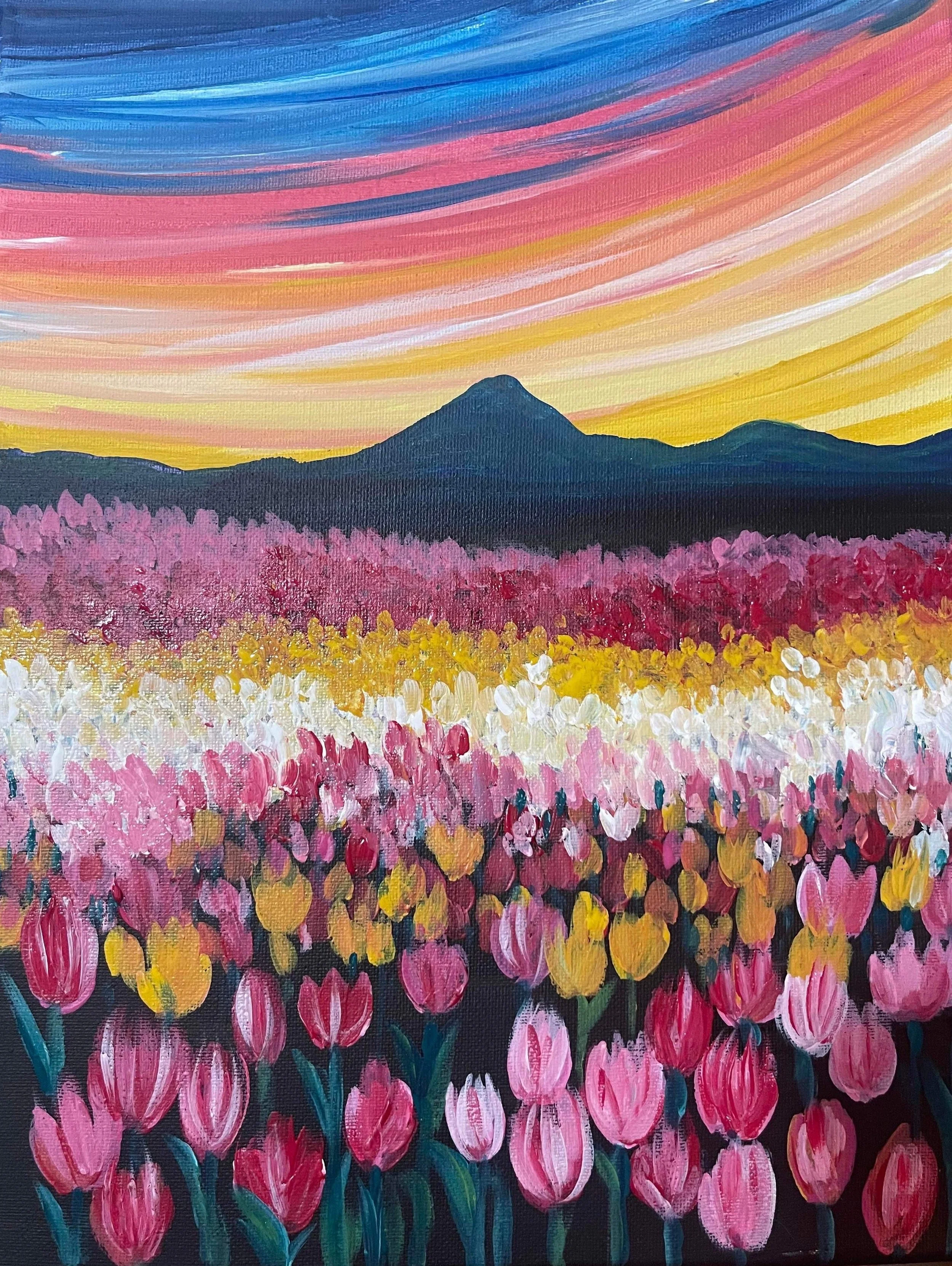 New Morning Bakery is centered in the heart of downtown Corvallis, offering more than coffee and cake. This lovely café has cozy-homey atmosphere that will bring you to the present moment, as you indulge in house-made lasagna, fresh salad, and all of the baked goodies you can imagine. There is also a 75ft wall displaying a handpicked artist's work that rotates each month - what better place to paint this beautiful field of tulips?