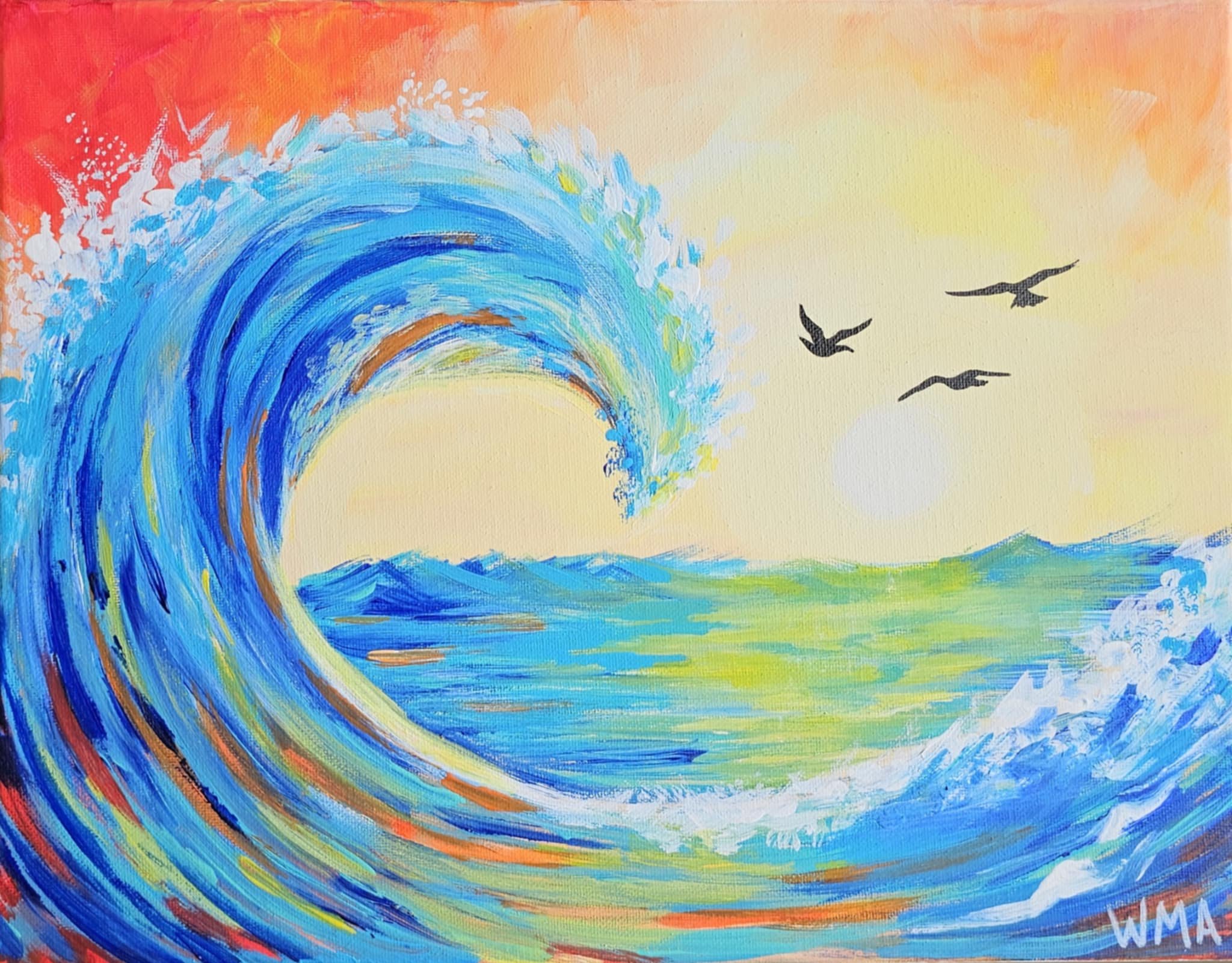 This gorgeous wave catches the light effortlessly. From thick brushstrokes to the vibrant pigments used, ANYONE can paint it! Come to Angel's Share Barrel House in Turner for a lovely evening out, all ages welcome.