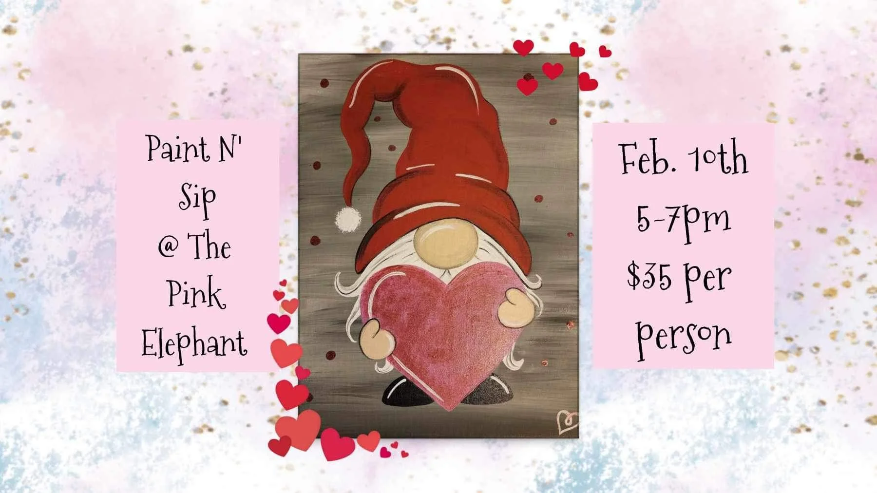 Bring your friends, family, and neighbors to one of many Paint N' Sip events at The Pink Elephant on Saturday, February 10th from 5-7pm! Beat the Valentines day rush and celebrate a little early!